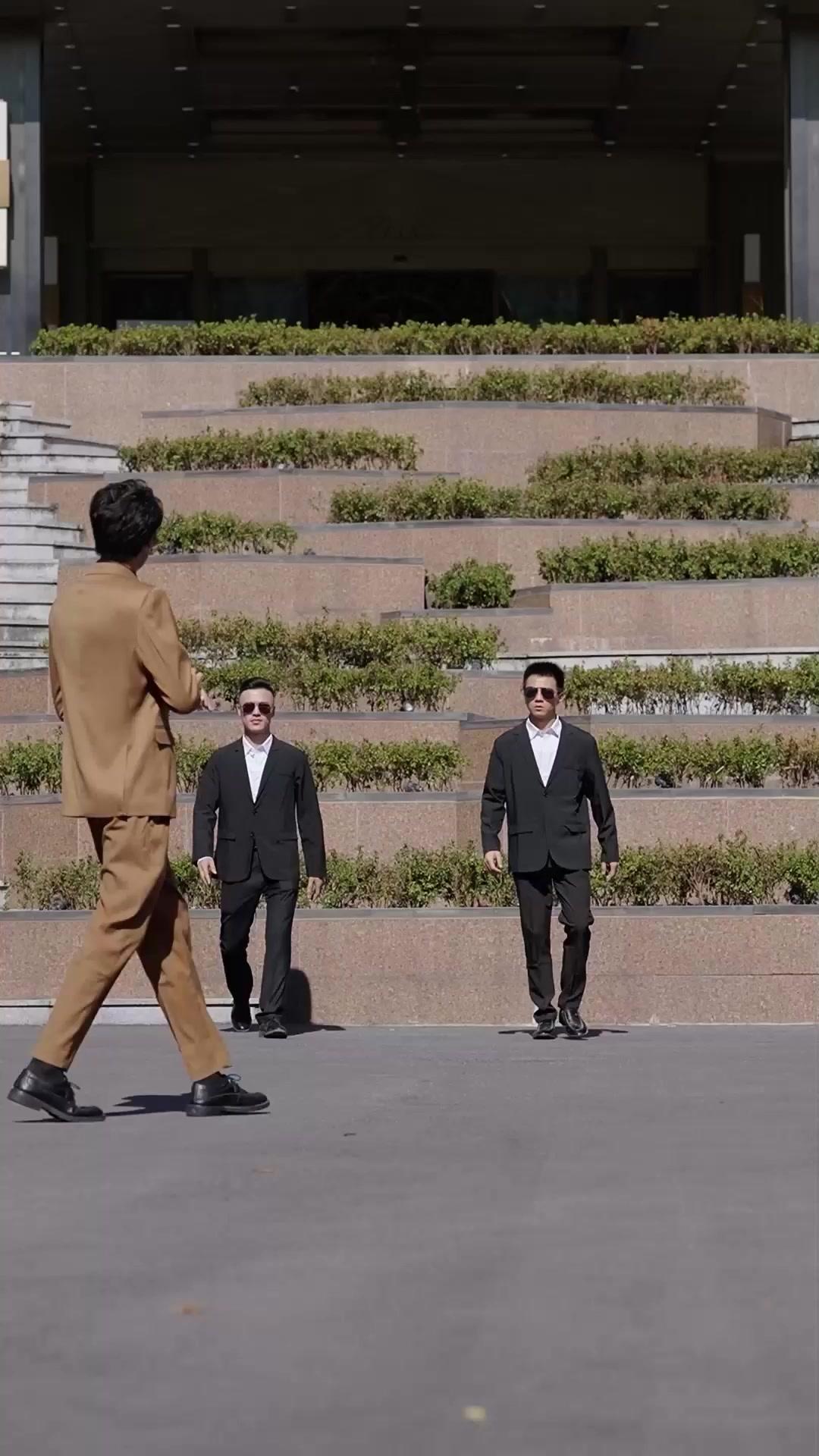 There’s a particular kind of tension that only exists in the moments *before* the storm breaks—when the air hums with unspoken threats, and every footstep echoes like a countdown. That’s the atmosphere in this excerpt from *Divine Dragon*, where three men stand on sunlit concrete, surrounded by manicured greenery and architectural grandeur, yet utterly isolated in their psychological standoff. Li Wei, the man in the tan suit, isn’t just dressed for success—he’s dressed for *survival*. His double-breasted jacket, with its six black buttons arranged like bulletproof plating, isn’t merely stylish; it’s a declaration of intent. The deer pin on his lapel? Not whimsy. In Chinese symbolism, the deer represents longevity, prosperity, and—crucially—*evasion*. He’s not charging forward. He’s circling. Waiting. Letting the others reveal themselves first.