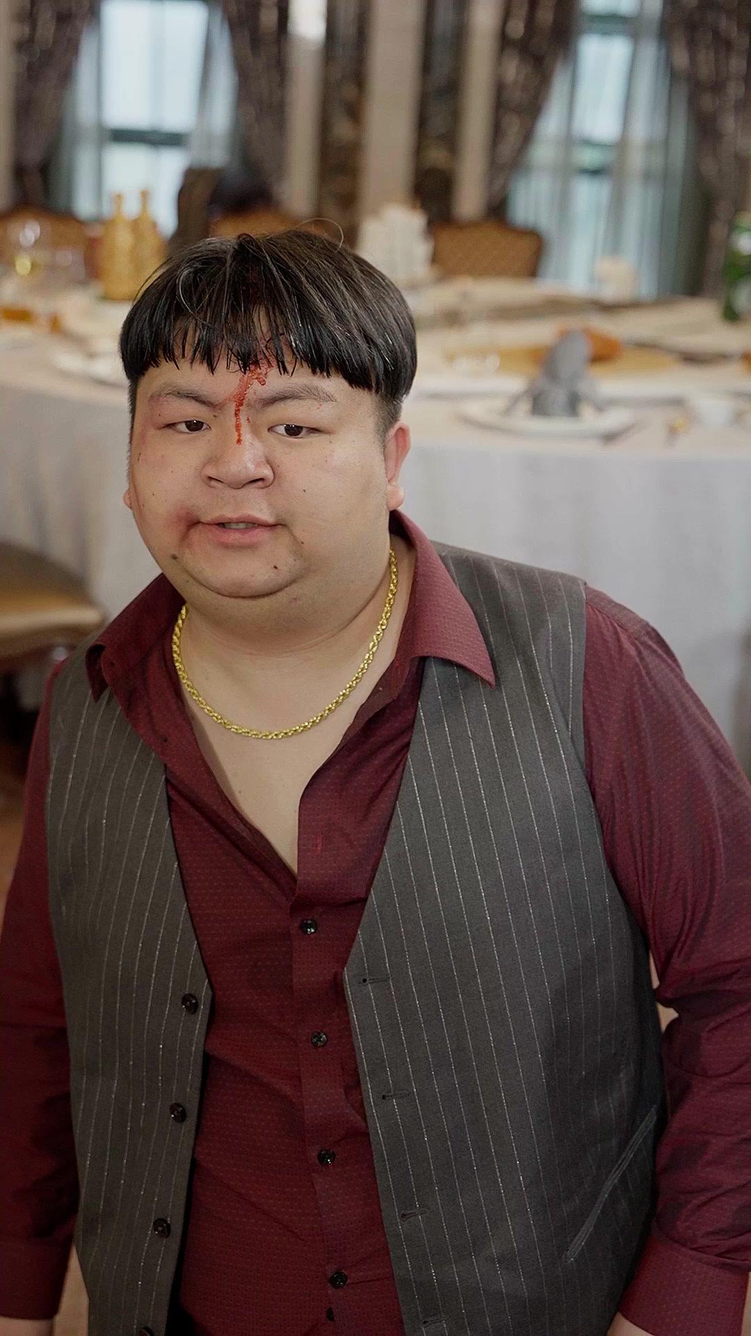 In a lavishly decorated banquet hall—gilded columns, crystal chandeliers, marble floors shimmering under soft ambient light—the tension doesn’t just simmer; it *boils*. What begins as a seemingly routine gathering of well-dressed elites quickly unravels into a psychological standoff where every gesture, every glance, carries the weight of unspoken history. At the center stands Li Wei, his maroon shirt slightly rumpled, his pinstriped vest askew, and a vivid streak of fake blood running down his forehead like a grotesque crown. He’s not injured—he’s *performing*. His exaggerated expressions—puffed cheeks, wide-eyed indignation, theatrical pointing—suggest he’s not merely reacting to provocation but *orchestrating* chaos. And yet, the others don’t laugh. They flinch. They recoil. Because in this world, absurdity isn’t comedy—it’s strategy.