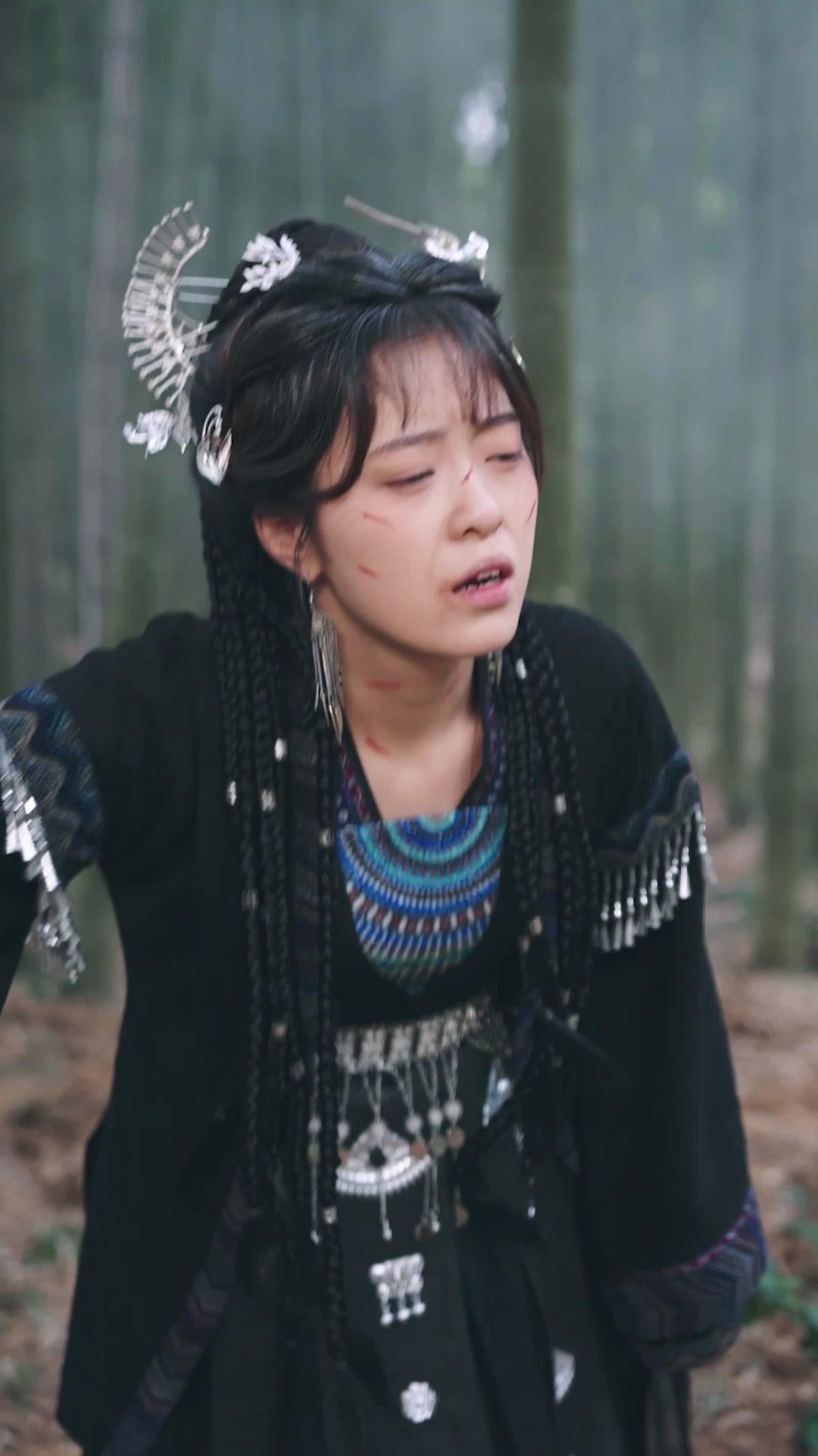 Let’s talk about the quiet devastation in that bamboo grove—where silence isn’t empty, it’s loaded. In *My Enchanted Snake*, we’re not just watching a scene; we’re witnessing a ritual of grief disguised as folklore. The first woman—let’s call her Lan—enters like a storm wrapped in black silk. Her hair is braided tight with silver ornaments shaped like cranes and crescents, each piece humming with ancestral weight. She stumbles, breath ragged, face streaked with red—not blood, not quite, but something more symbolic: war paint, or maybe self-inflicted penance. Her eyes flicker between panic and resolve, as if she’s rehearsing a confession she hasn’t yet dared to speak aloud. And then she sees them: two white flowers, spiky and unnatural, blooming defiantly from the forest floor. Not chrysanthemums, not peonies—something alien, almost synthetic in their precision. She kneels. Not in prayer. In accusation. Her hands hover over the blooms like she’s afraid they’ll vanish—or worse, *answer* her.