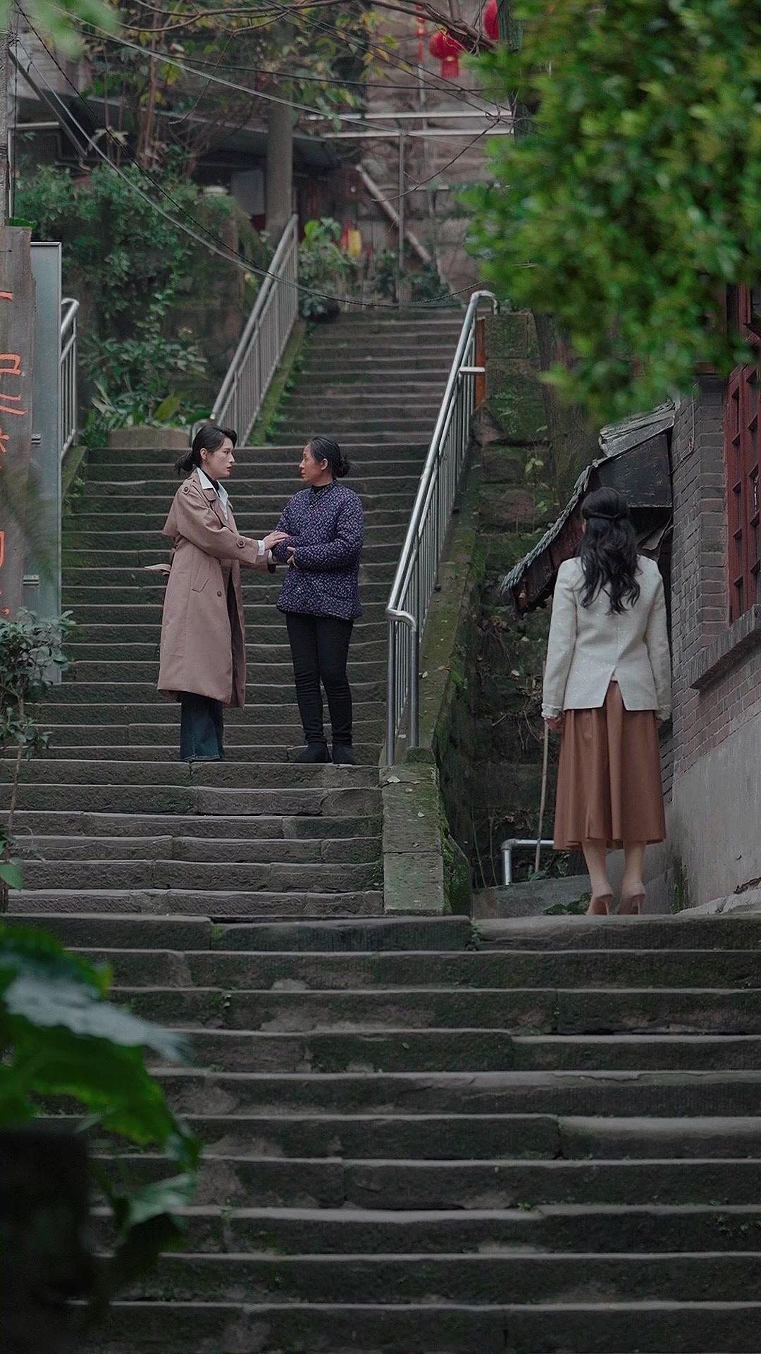 There’s a particular kind of intimacy that only steep, narrow staircases can foster—especially when they’re carved from centuries-old stone, slick with rain and memory. In Silent Goodbye, Unseen Return, the staircase isn’t just a location; it’s a character, a witness, a stage where three women perform a ritual older than language: the slow, painful, necessary act of reconnection. Lin Xiao, sharp-edged in her trench coat and polished demeanor, stands halfway up, gripping the railing like it’s the only thing keeping her from falling backward into the past. Her hair is pulled back with discipline, her makeup immaculate—even her grief is curated. But then Aunt Mei steps forward, her quilted jacket rustling like dry leaves, and everything changes. Because Aunt Mei doesn’t approach with demands or accusations. She approaches with an egg. And in that single, absurdly simple gesture, the entire emotional architecture of the scene collapses and rebuilds itself in real time.